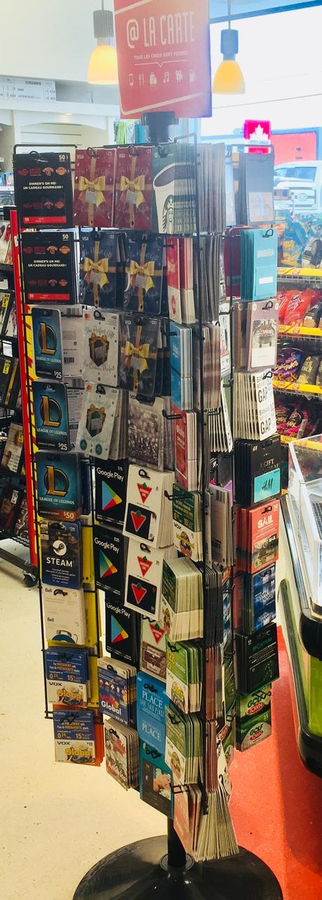 Sauvez du temps et venez acheter la carte cadeau de votre magasin préféré dans notre présentoir de cartes cadeaux.