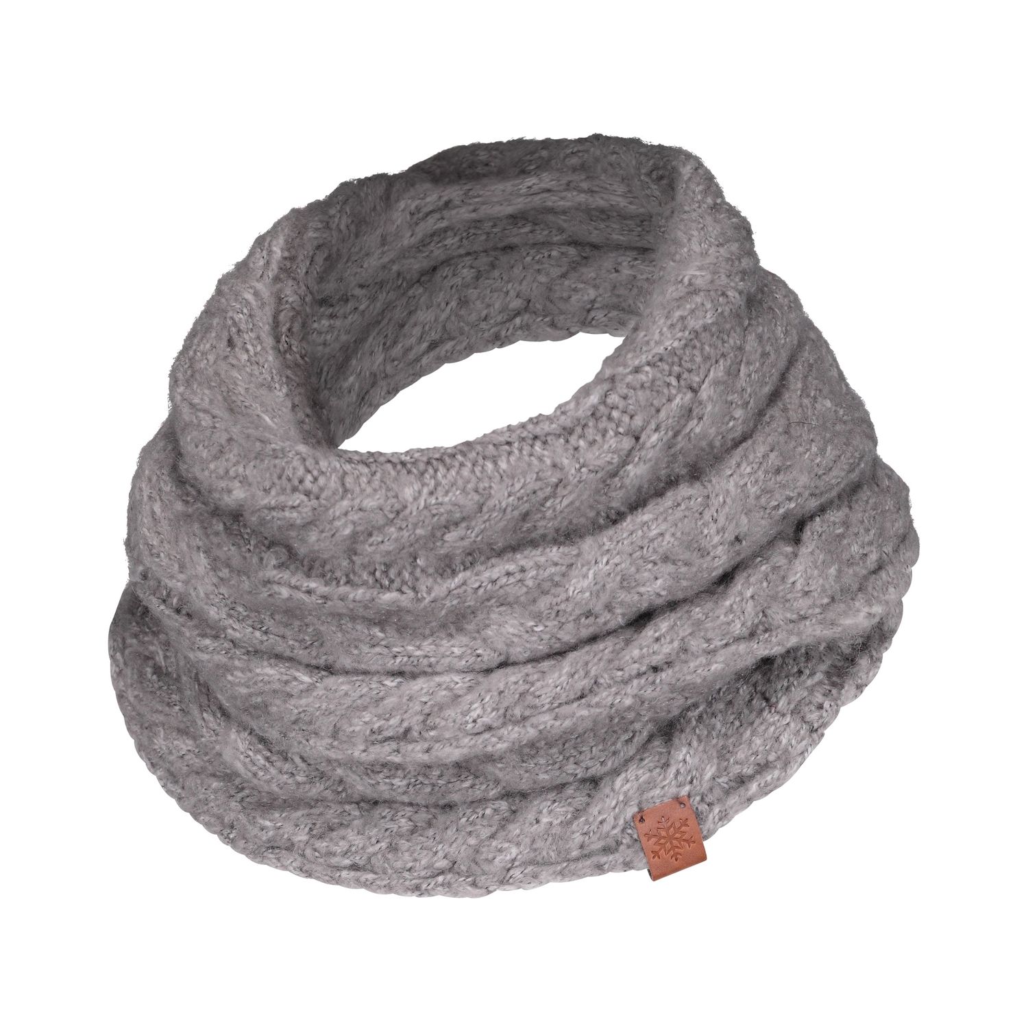 Foulard infinité en tricot à motif torsadé, fait d'un mélange de laine, acrylique et polyester.